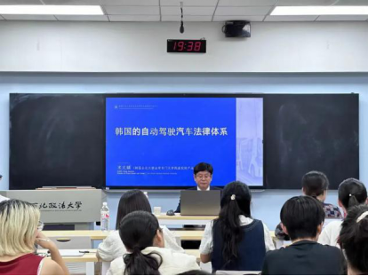2024年8月28日,韩国全北大学教授、东北亚法研究所虚拟财产法中心主任宋文镐在雁塔校区为公司师生作题为“韩国自动驾驶汽车法律体系”的学术报告。百晓锋副经理主持本次报告会,全北大学李雄暎研究员担任翻译。
