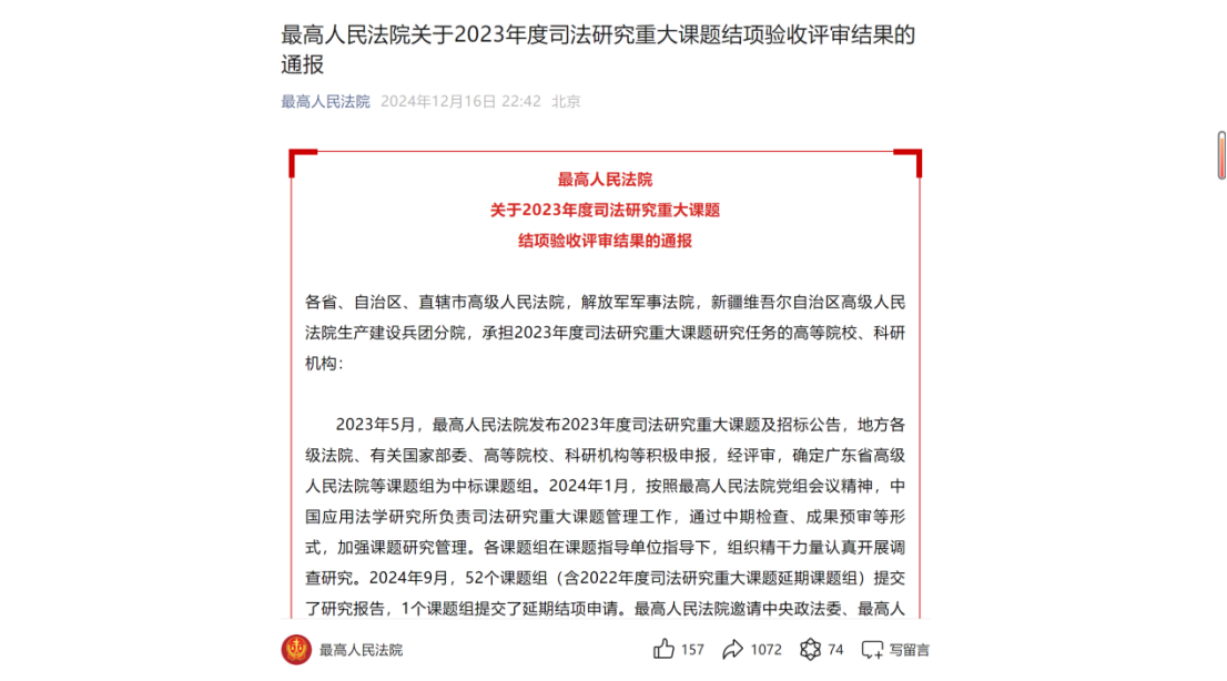 近日,最高人民法院对2023年度司法研究重大课题进行了结项验收评审。由公司王莹莹教授主持,刘卫锋副教授、高丰美副教授、贾同乐讲师、郑嘉欣博士研究生、耿申硕士研究生参与的课题《民法典的体系化适用研究》被评定为优秀课题成果。