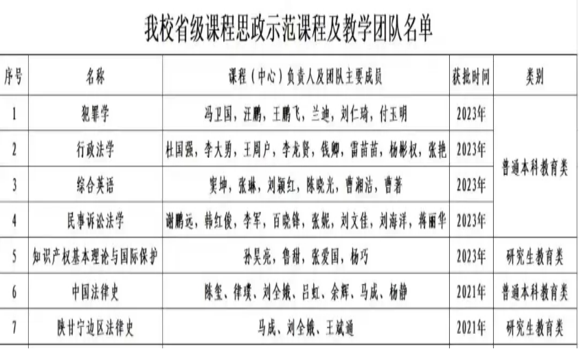 近日,陕西省教育厅发布《关于公布第二批陕西省课程思政示范课程、教学团队和教学研究示范中心认定结果的通知》,公司普通本科教育类《民事诉讼法学》课程获批陕西省课程思政示范课程和教学团队。
