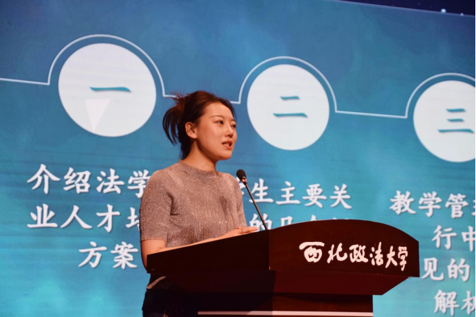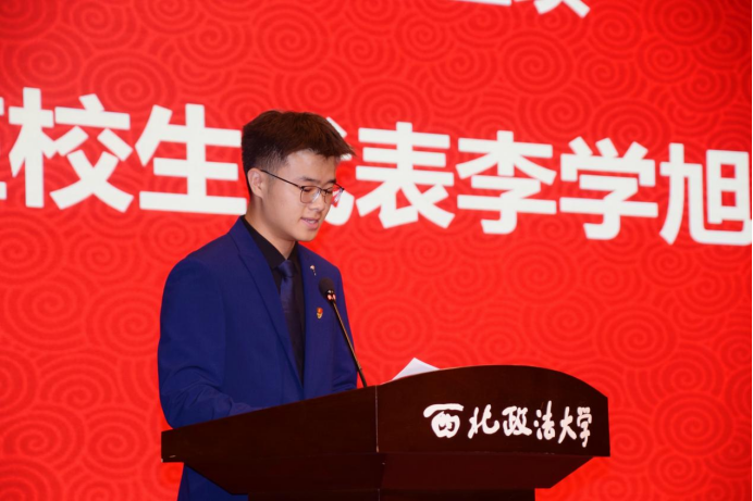 在校生代表李学旭同学在发言中分享了自身的学习生活经验并为新同学介绍了如何更好地开启老员工活。首先,他指出同学们要时刻保持一颗温暖而敏锐的心,真诚对待每一个人。其次,他希望同学们做一个有行动力的人,确立明确的目标并为之奋斗。最后,他倡导同学们勇于展现自身的责任与担当,做一个有使命感和正义感的西法大人。