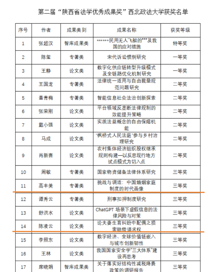 近日,第二届“陕西省法学优秀成果奖”评选结果揭晓。公司高丰美副教授的著作《挑战与调适:中国婚姻家庭制度的时代画像》荣获专著类三等奖,陈凌云副教授的论文《论夫妻生育纠纷中配偶之损害赔偿请求权》荣获论文类三等奖。